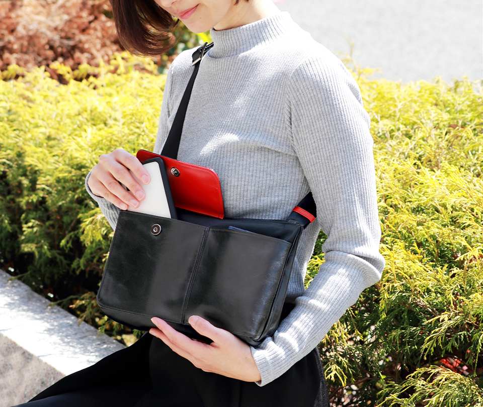前面に牛革を、背面にはナイロン生地を使用しているので、軽くて柔らかい使い心地。マチが薄くてかさばらず、身体と一体化するように馴染みます。
